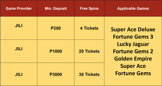 Double your luck twice a week! Why just deposit when you can get Free Spin Tickets on top of your cash? Every Tuesday and Friday, JILI gives you extra chances to hit the jackpot on your favorite Slot Games. The more you deposit, the more Free Spins you unlock!
